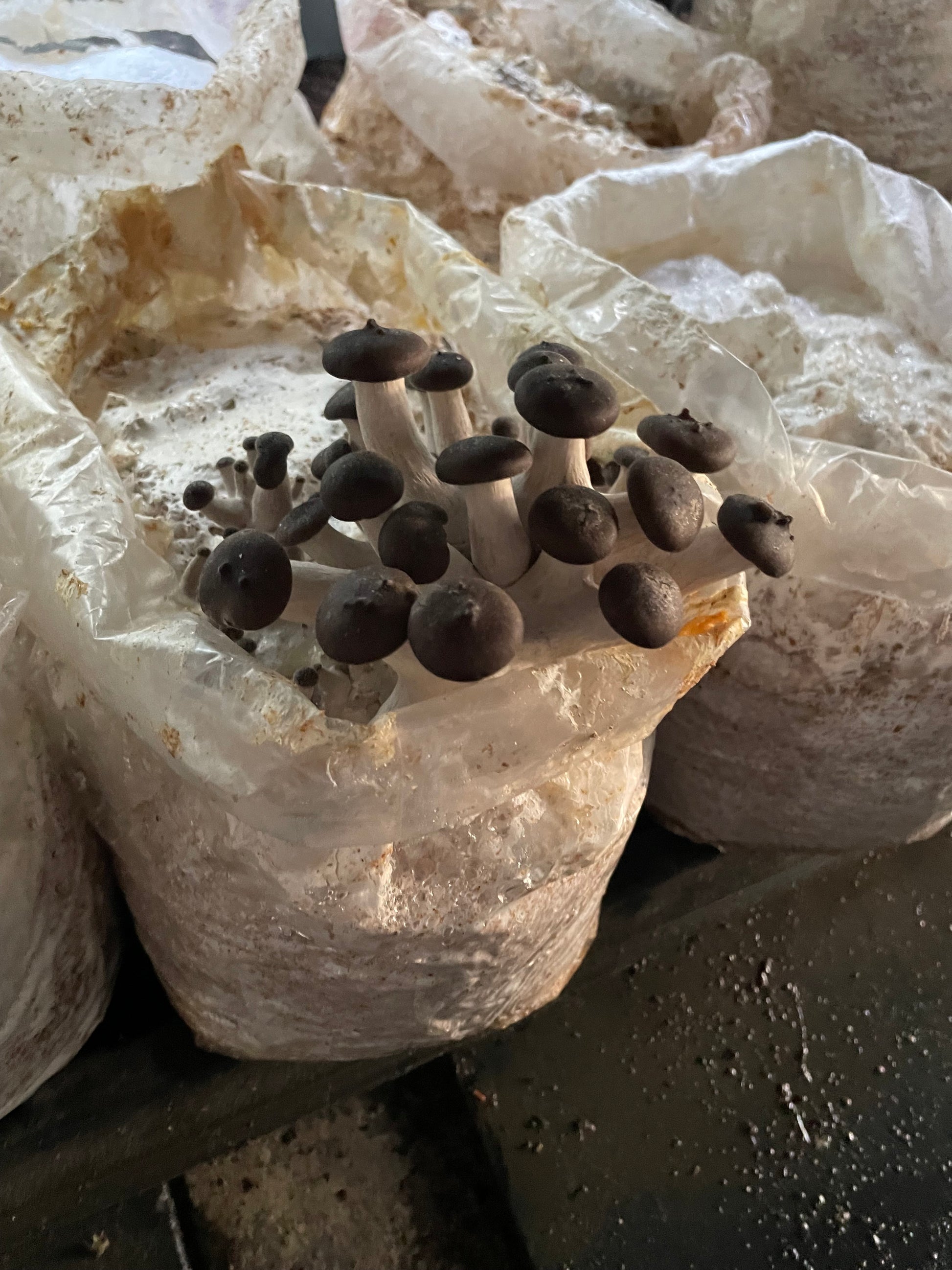 Description: A medium-large variety of the wood oyster mushroom, which features a black cap and tender fleshy stem similar to the true king oyster mushroom. This species is easy to grow and substrate adaptive like the wood oyster mushroom, but has the superior culinary qualities of the king oyster mushroom. Great for growth outdoors or on sawdust blocks indoors and high yielding. The downside of this species compared to blue oyster is that it requires a few weeks of rest after colonization before primordia form.